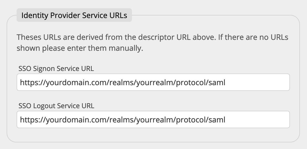 SSO Signon Service URL und SSO Logout Service URL prüfen und ggf. ändernNachdem Sie die SSO IDP Descriptor URL eingegeben haben, werden die Service-URLs aus der Descriptor URL extrahiert und die Felder für die SSO Signon Service URL und die SSO Logout Service URL werden vorausgefüllt.