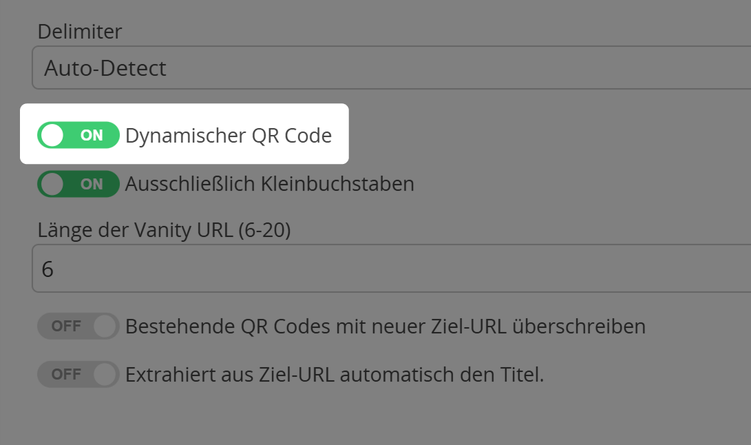 Screenshot der Option "Dynamischer QR Code" beim Import von QR Codes | Deaktivieren Sie diese Option, um statische QR Codes zu erstellen.